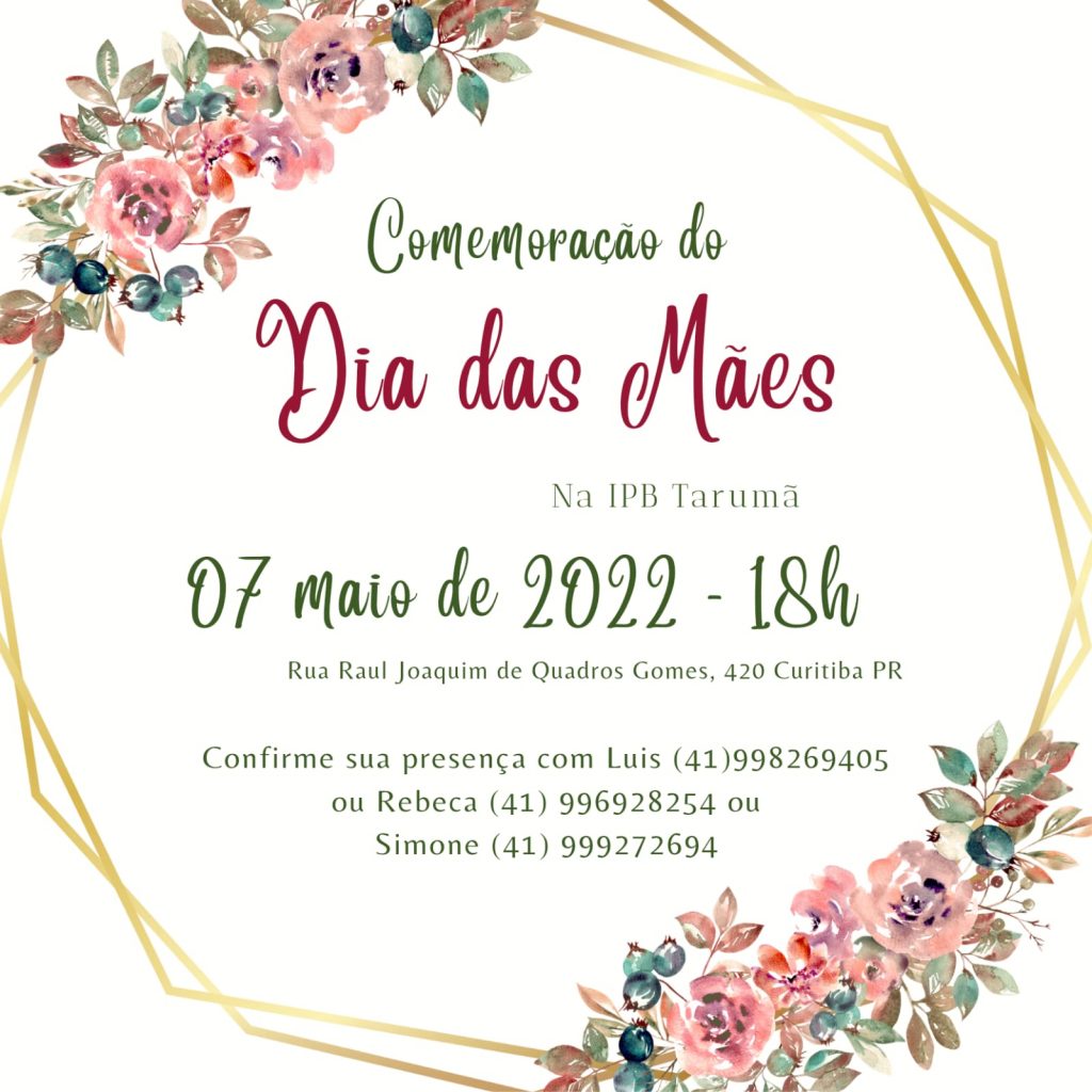 Neste final de semana faremos nossa Comemoração em homenagem ao Dia das Mães! Teremos um momento especial para homenagear nossas queridas mamães, junto com nossos familiares. Será um tempo precioso na presença de Deus! Convide seus familiares e venha participar deste momento Especial! Horário: -Sábado, 07/05 às 18h. – Local: Igreja Presbiteriana […]